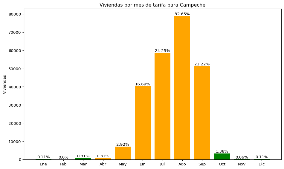 Siguiendo la metodología previamente descrita, se determinaron los meses de tarifa aplicables para las viviendas del estado de Campeche. En la Figura 4.1 se presenta la distribución de dichas tarifas a lo largo del año. Entre las viviendas con información suficiente para estimar su consumo, el 98.05 % reportó un pago correspondiente a una tarifa de verano, mientras que el 1.95 % restante declaró un pago fuera del periodo de verano.